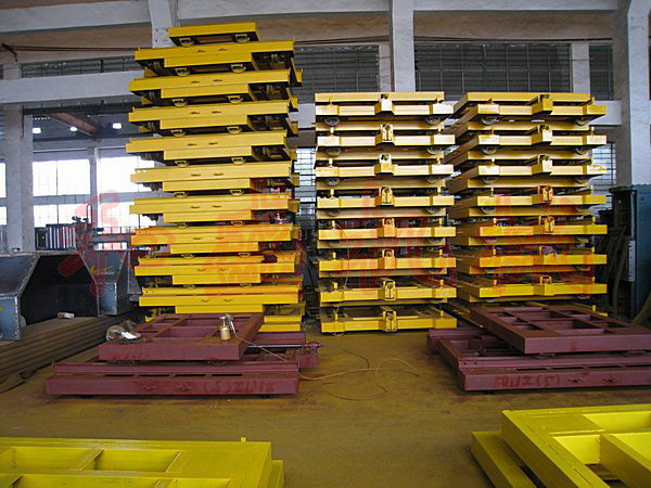 4:臺車用國標(biāo)槽鋼四周雙層加固。臺車輪加大用Φ250mm(軸承6411或6312);料車輪用鋼制Φ215mm(軸承7210)。