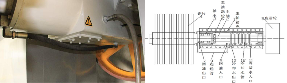 3:主軸箱采用專(zhuān)利技術(shù)“切石機(jī)刀具主軸冷卻結(jié)構(gòu)”,解決了切石機(jī)作業(yè)過(guò)程中主軸易發(fā)熱問(wèn)題,可進(jìn)一步提升潤(rùn)滑油降溫效果,大大提高主軸箱軸承、主軸等使用壽命,降低維修成本。