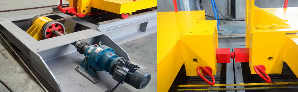 4:工作料車(chē)采用往復(fù)驅(qū)動(dòng)裝置,可提高料車(chē)行走效率有利于提高產(chǎn)量。料車(chē)與牽拉帶的連接部位加裝有“載料車(chē)分合插銷(xiāo)”,解決了老機(jī)型更換荒料時(shí)要在工作臺(tái)上調(diào)整荒料位置后才能開(kāi)機(jī)作業(yè),浪費(fèi)有效加工時(shí)間的問(wèn)題。