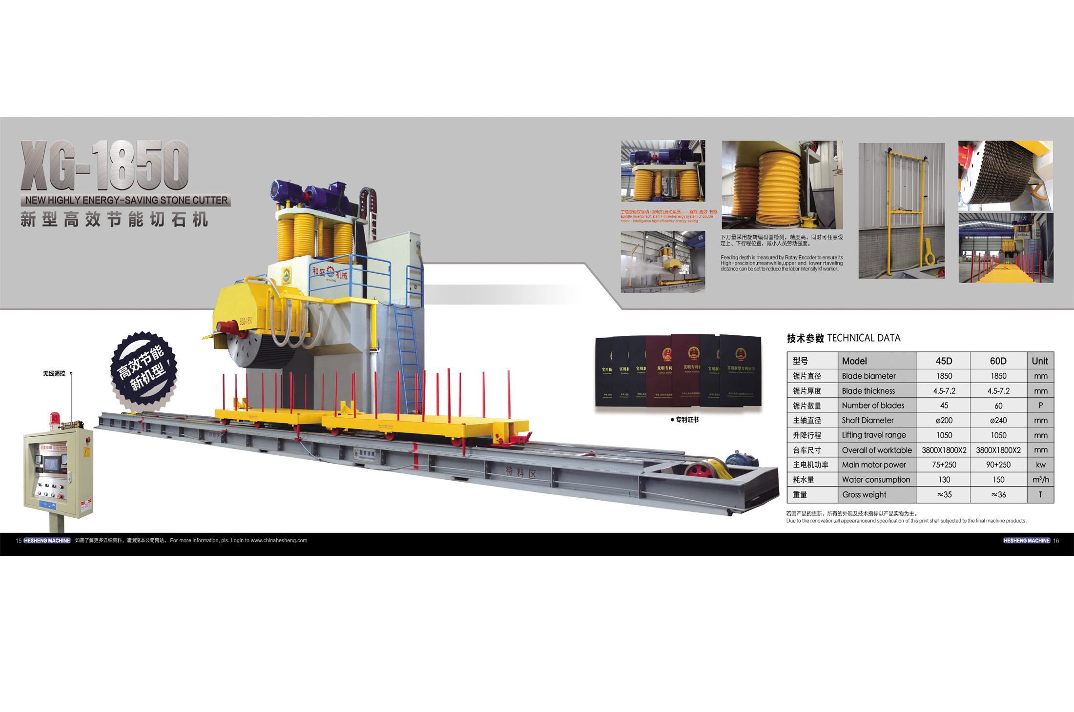 XG-1850新型高效節(jié)能切石機(jī),采用了機(jī)、電、儀、液一體化高新技術(shù)和公司6件發(fā)明專(zhuān)利和9件實(shí)用新型專(zhuān)利技術(shù),經(jīng)反復(fù)的試驗(yàn)改進(jìn),創(chuàng)新開(kāi)發(fā)的新一代切石機(jī)產(chǎn)品。它具有結(jié)構(gòu)新穎、剛性好,切割效率高、切割的板材表面平整度好,生產(chǎn)成本低,節(jié)能降耗顯著、操作維修方便等特點(diǎn)。它與傳統(tǒng)的切石機(jī)相比,切割同一規(guī)格的石荒料可以多切5~8%的板材,節(jié)約石料11%,減少石粉排出40%左右,節(jié)約耗能約10~15%。